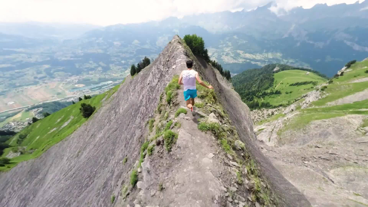 Os aventureiros são Seb Montaz e Kilian Jornet. Este trilho de cortar a respiração fica em Aiguille de Varan, na França.